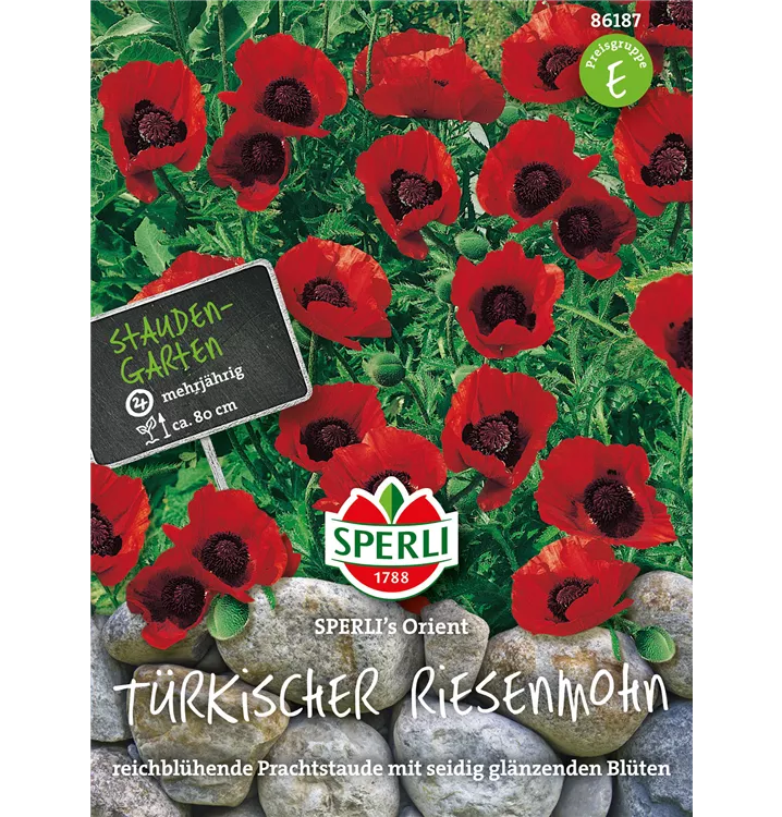 Der Türkische Riesenmohn 'Orient' (Papaver orientale) ist eine aufrechte Staude, die im Juni dunkelrote, schalenförmige Blüten bildet. An einem sonnigen Standort mit durchlässigem Boden erreicht er gewöhnlich eine Höhe von ca. 80 cm und wird ca. 50 cm breit. Der Türkische Riesenmohn 'Orient' ist gut frostverträglich.