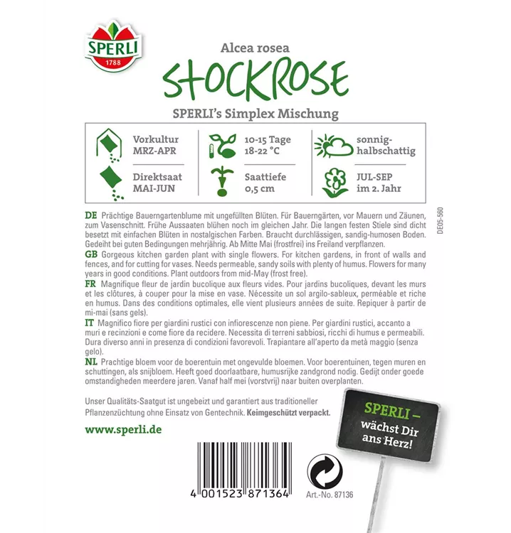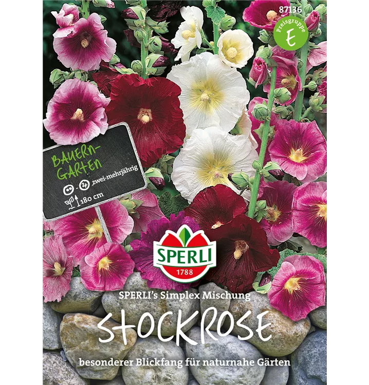 Die Einfachblühende Stockrose 'Simplex' (Alcea rosea) ist eine aufrechte, horstbildende Staude, die, je nach Sorte, schalenförmige Blüten in verschiedenen Farben bildet. An einem sonnigen Standort mit durchlässigem Boden erreicht sie gewöhnlich eine Höhe von ca. 1,8 m und wird ca. 60 cm breit. Die Einfachblühende Stockrose 'Simplex' ist gut frostverträglich.