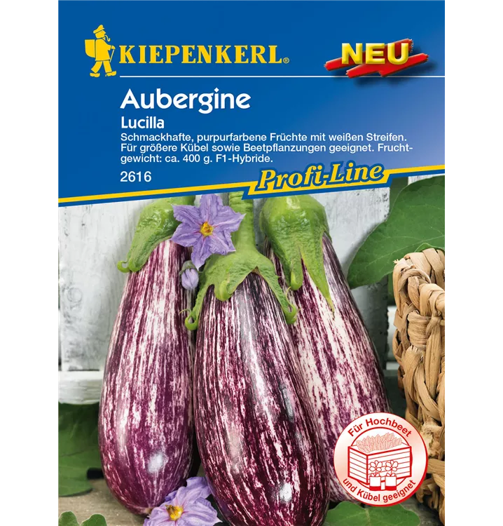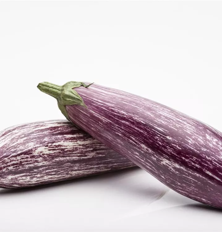 Die Aubergine 'Lucilla' (Solanum melongena) bildet Früchte, die mild schmecken und bereits ab Juli geerntet werden können. Für das optimale Wachstum der Aubergine 'Lucilla' werden ein sonniger Standort und durchlässiger, nährstoffreicher Boden benötigt.