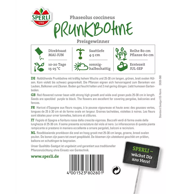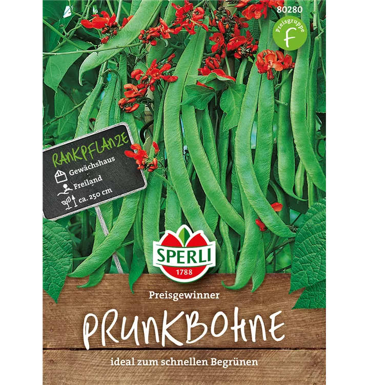 Die Prunk-Bohne 'Preisgewinner' (Phaseolus coccineus) bildet Früchte, die aromatisch schmecken und bereits ab Juli geerntet werden können. Für das optimale Wachstum der Prunk-Bohne 'Preisgewinner' werden ein sonniger Standort und durchlässiger, nährstoffreicher Boden benötigt.