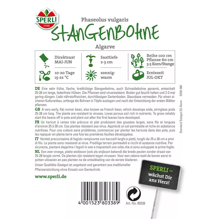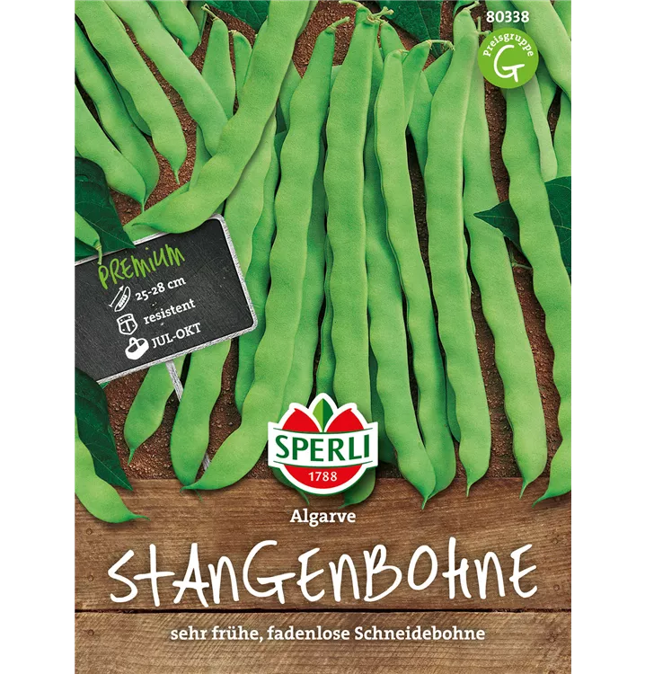 Die Stangenbohne 'Algarve' (Phaseolus vulgaris) bildet Hülsenfrüchte, die aromatisch schmecken und bereits ab Juli geerntet werden können. Für das optimale Wachstum der Stangenbohne 'Algarve' werden ein sonniger Standort und durchlässiger, nährstoffreicher Boden benötigt.