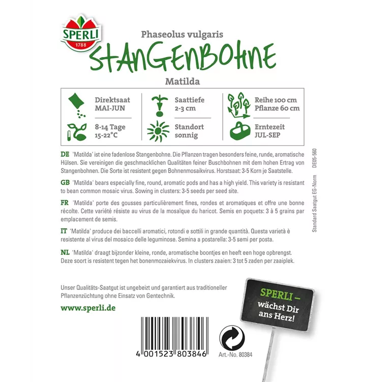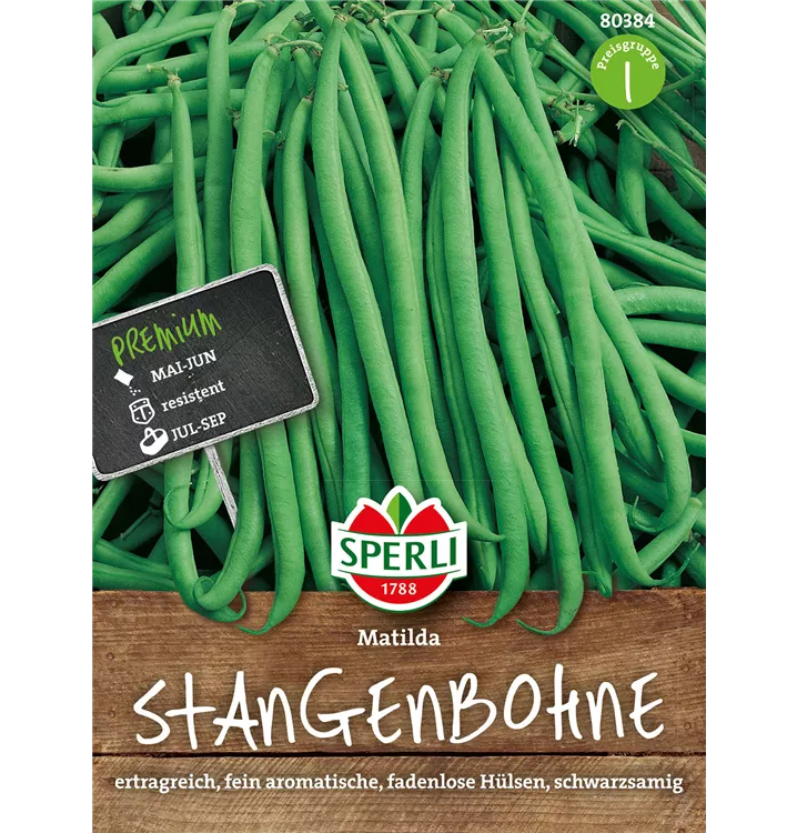 Die Stangenbohne 'Matilda' (Phaseolus vulgaris) bildet Hülsenfrüchte, die aromatisch schmecken und bereits ab Juli geerntet werden können. Für das optimale Wachstum der Stangenbohne 'Matilda' werden ein sonniger Standort und durchlässiger, nährstoffreicher Boden benötigt.