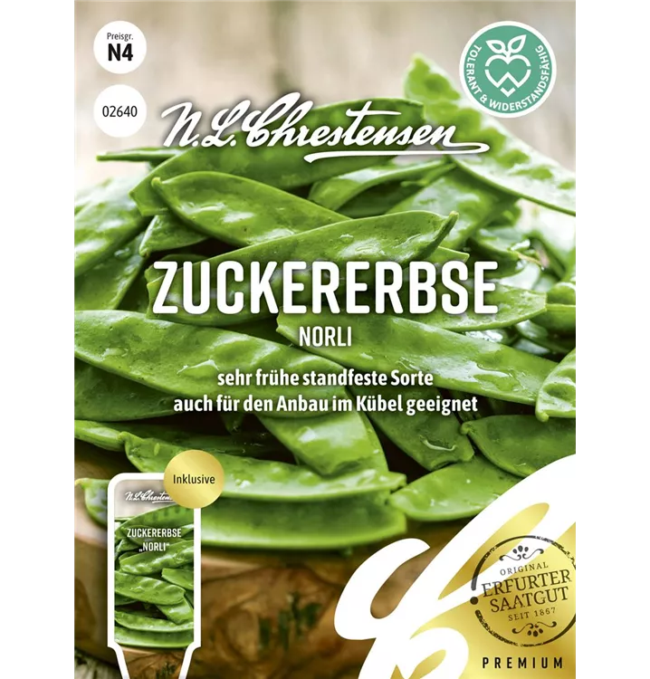 Die Kiefelerbse 'Norli' (Pisum sativum) bildet Hülsenfrüchte, die süß, aromatisch schmecken und bereits ab Juli geerntet werden können. Für das optimale Wachstum der Kiefelerbse 'Norli' werden ein sonniger Standort und durchlässiger, nährstoffreicher Boden benötigt.