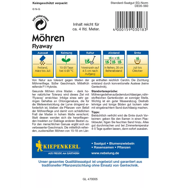 Für das optimale Wachstum der Möhre 'Flyaway F1' werden ein sonniger Standort und durchlässiger, nährstoffreicher Boden benötigt.