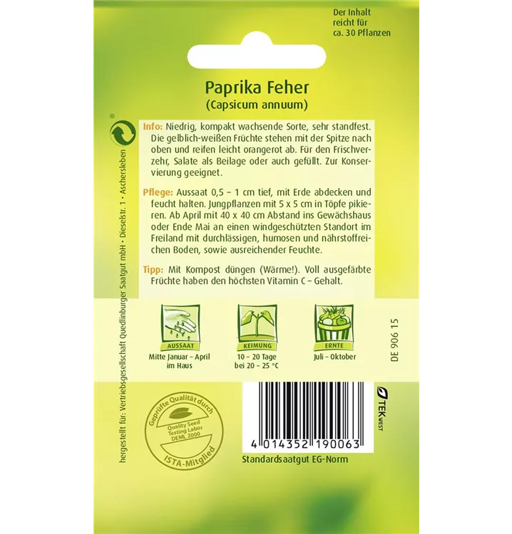 Die Paprika 'Feher' ist als Kübelpflanze, aber auch im Gemüsegarten, zum Frischverzehr, zum Kochen oder für Salat sehr beliebt.