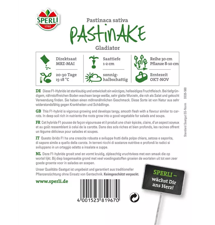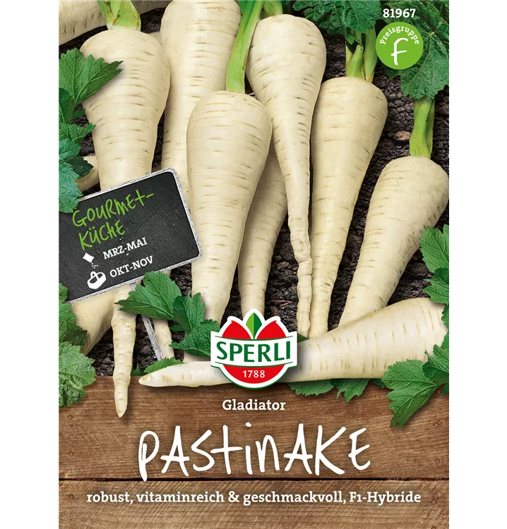 Die Pastinake 'Gladiator F1' (Pastinaca sativa) bildet Wurzeln, die würzig schmecken und bereits ab Oktober geerntet werden können. Für das optimale Wachstum der Pastinake 'Gladiator F1' werden ein sonniger Standort und durchlässiger, nährstoffreicher Boden benötigt.