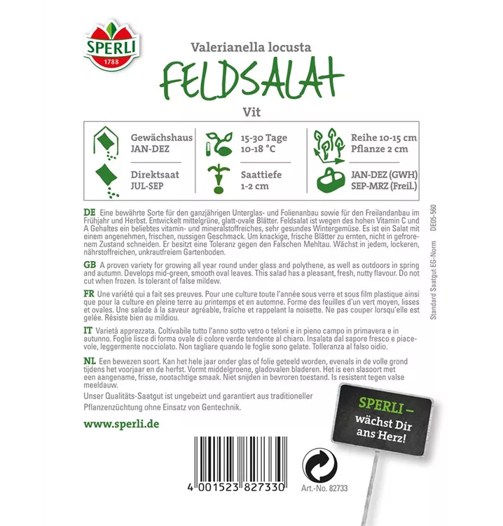 Der Feldsalat 'Vit' (Valerianella locusta) ist eine aromatisch, nussig schmeckende Gemüsepflanze. Seine Blätter können geerntet werden, sobald er ca. 10 erreicht hat. Für das optimale Wachstum des Feldsalats 'Vit' werden ein sonniger Standort und durchlässiger, nährstoffreicher Boden benötigt.