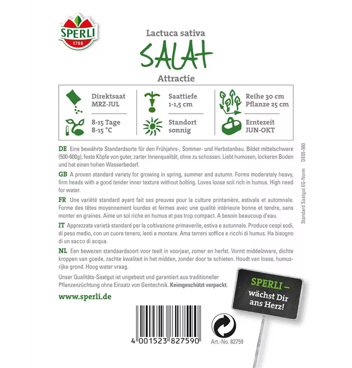 Der Kopfsalat 'Attraktion' (Lactuca sativa) ist eine aromatisch schmeckende Gemüsepflanze. Seine Blätter können geerntet werden, sobald er ca. 20 erreicht hat. Für das optimale Wachstum des Kopfsalats 'Attraktion' werden ein sonniger Standort und durchlässiger, nährstoffreicher Boden benötigt.