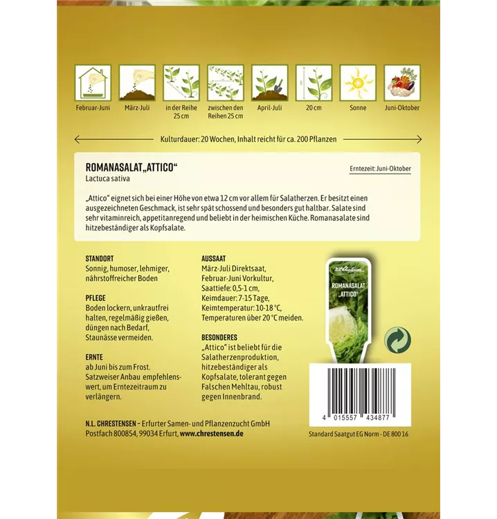 Der Romanasalat 'Attico' (Lactuca sativa) ist eine aromatisch schmeckende Gemüsepflanze. Seine Blätter können geerntet werden, sobald er ca. 20 erreicht hat. Für das optimale Wachstum des Romanasalats 'Attico' werden ein sonniger Standort und durchlässiger, nährstoffreicher Boden benötigt.