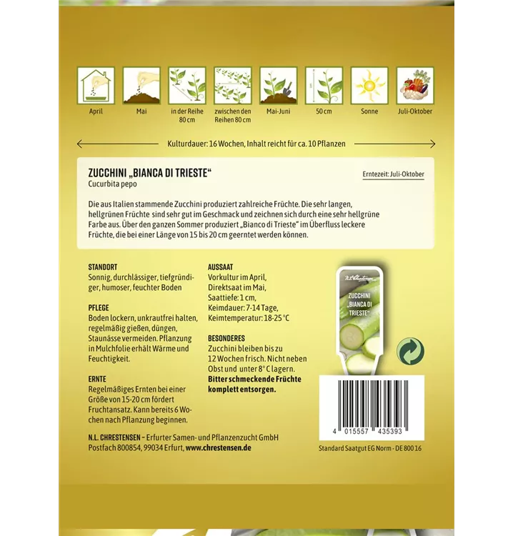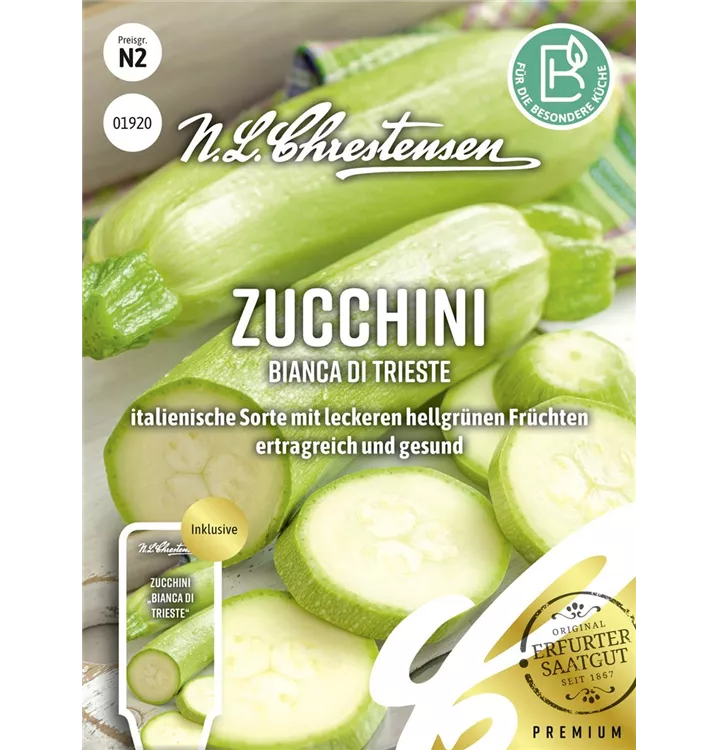 Der Zucchini 'Bianca di Trieste' ist im Gemüsegarten, aber auch zum Kochen, für Salat, für Suppen & Eintöpfe oder zum Verzehr sehr beliebt.