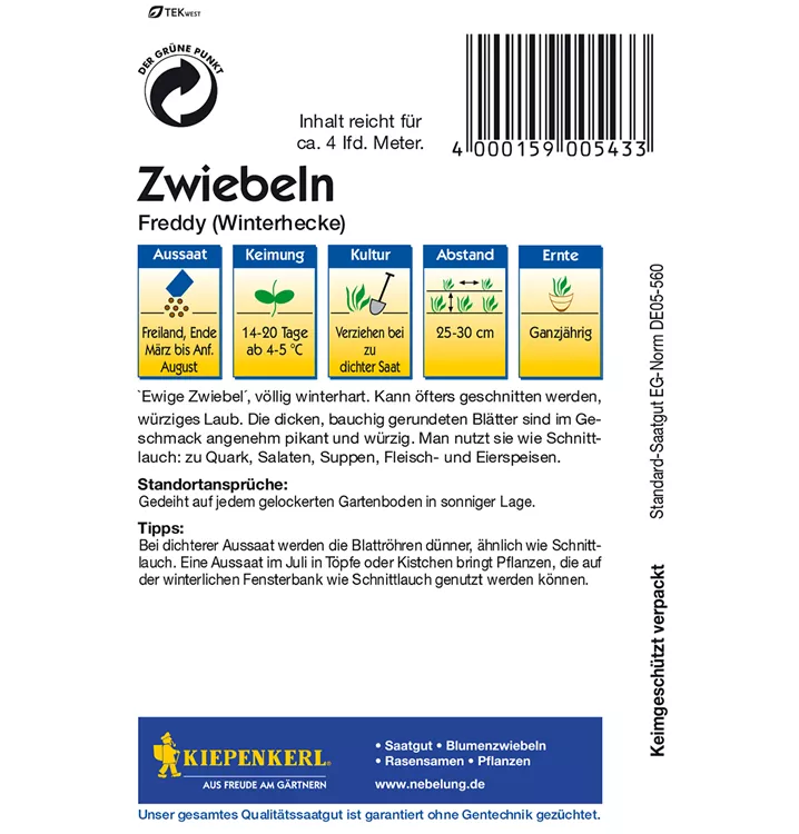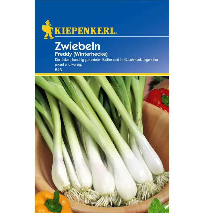 Die Winterzwiebel 'Freddy' (Allium fistulosum) ist eine Kräuterpflanze mit einem aromatischen, würzigen, milden Geschmack. Ihre grau-grünen Blätter sind rundlich. Für das optimale Wachstum der Winterzwiebel 'Freddy' werden ein sonniger Standort und durchlässiger, nährstoffreicher Boden benötigt.