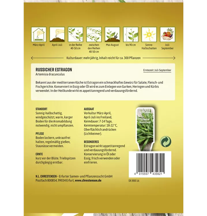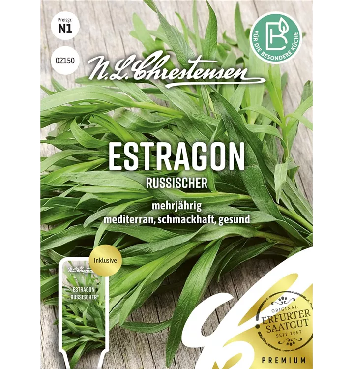 Der Rusischer Estragon (Artemisia dracunculus) ist eine Kräuterpflanze mit einem würzigen Geschmack. Seine mittelgrünen Blätter sind gefingert. Für das optimale Wachstum des Rusischer Estragons werden ein sonniger Standort und durchlässiger, nährstoffreicher Boden benötigt.