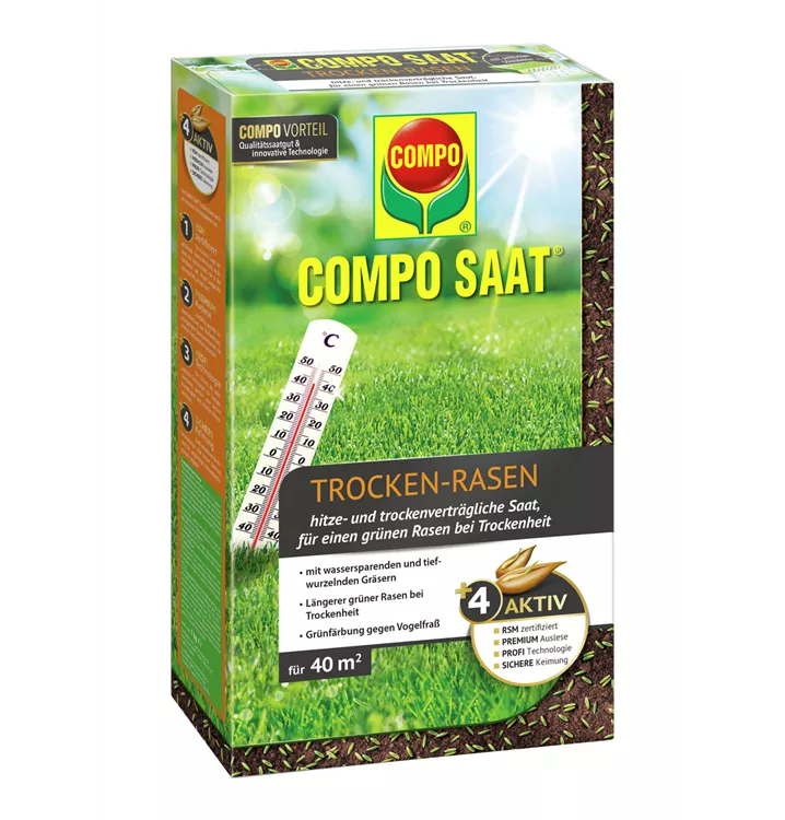 Spitzensorten für tiefgrünen, widerstandsfähigen Trocken-Rasen (RSM 2.2.2). Wassersparende Gräser. Sichere Keimung dank wirkaktiven Keimbeschleuniger.